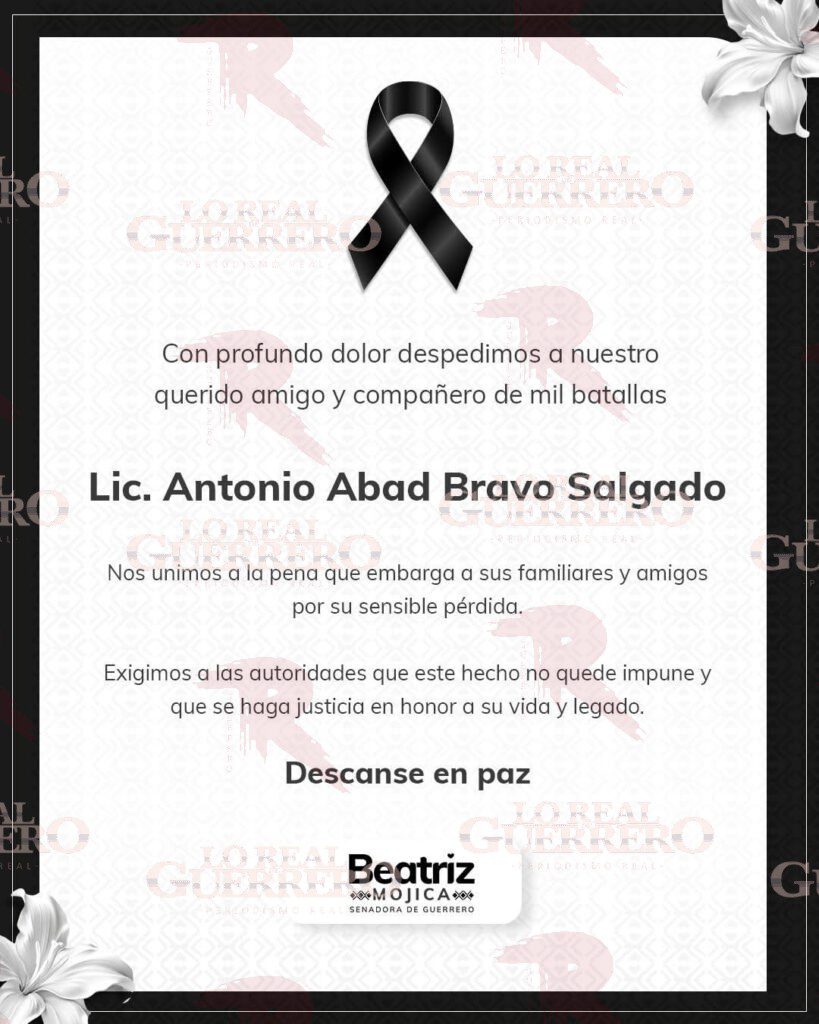 “Toño Bravo” fue colaborador cercano y afín a la senadora de Morena Beatriz Mojica Morga, relación política similar a la que mantenía el abogado Anselmo Campuzano Martínez, asesinado también en Iguala el pasado 3 de octubre, luego de una persecución a balazos.
