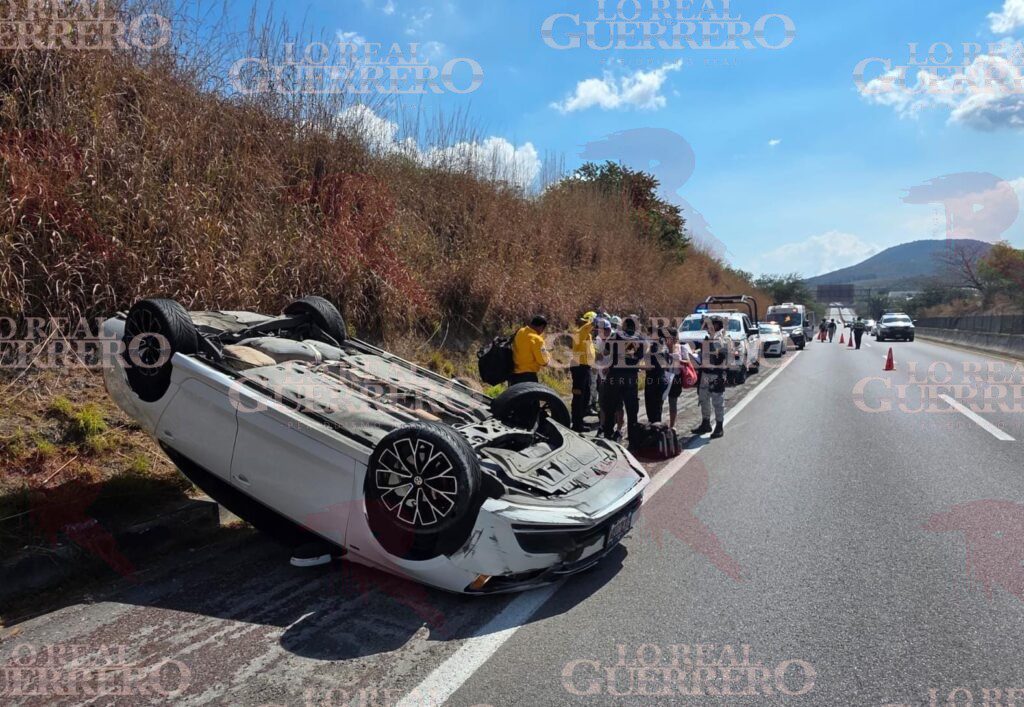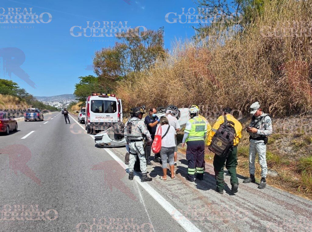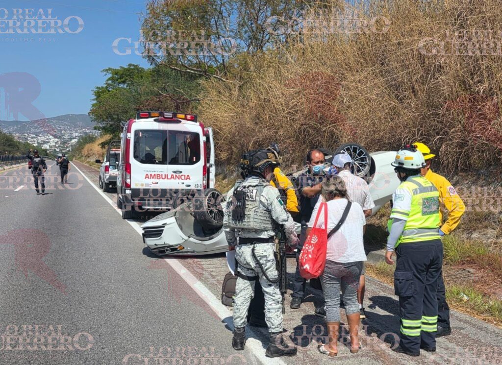 Chilpancingo, Gro., jueves 29 de enero de 2026.– Un hombre de nacionalidad canadiense resultó policontundido tras volcar el automóvil en el que viajaba junto con su esposa sobre la Autopista del Sol, en los carriles sur–norte, presuntamente debido al exceso de velocidad.El accidente ocurrió alrededor de las 12:48 horas, a la altura del kilómetro 280, cerca del fraccionamiento Nuevo Mirador, al sur de la capital, donde el conductor de un Volkswagen Jetta, color blanco, perdió el control del vehículo y terminó volcado fuera de la carpeta asfáltica.En el automóvil viajaban Norman G. Holden, de 70 años de edad, de nacionalidad canadiense y con domicilio en el fraccionamiento Magallanes de Acapulco, así como su esposa, quien no presentó lesiones de gravedad.Paramédicos de Protección Civil del Estado acudieron al lugar y brindaron atención médica a Holden, quien fue diagnosticado como policontundido; sin embargo, decidió permanecer en el sitio a la espera de su aseguradora, por lo que personal de CAPUFE se encargó de resguardar el área y a los involucrados.Al lugar arribaron también agentes de la Guardia Nacional, sector Caminos, quienes realizaron los peritajes correspondientes y posteriormente ordenaron que el vehículo fuera remolcado al corralón.De manera preliminar, se informó que el exceso de velocidad habría sido la causa del accidente, al provocar que el conductor perdiera el control del automóvil.