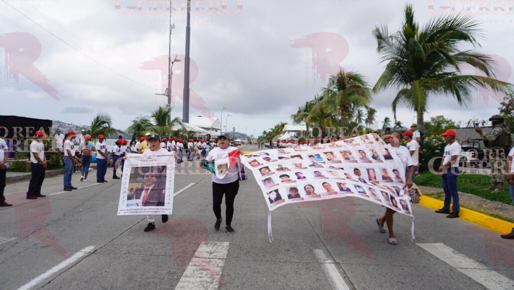 Acapulco, Gro., A 16 de septiembre del 2025.- Para exigir que dejen de retirar las fotografías que pegan en espacios públicos, integrantes de la colectiva “Memoria, Verdad y Justicia”, protestaron en el desfile Cívico-Militar en Acapulco