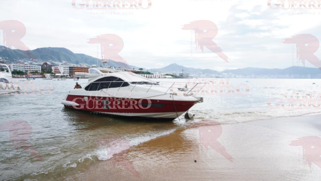 Acapulco, Gro., 22 de septiembre de 2025.– Un yate de recreo encalló durante la madrugada debido a los fuertes vientos provocados por la tormenta tropical Narda, en una playa de la zona tradicional de Acapulco.
