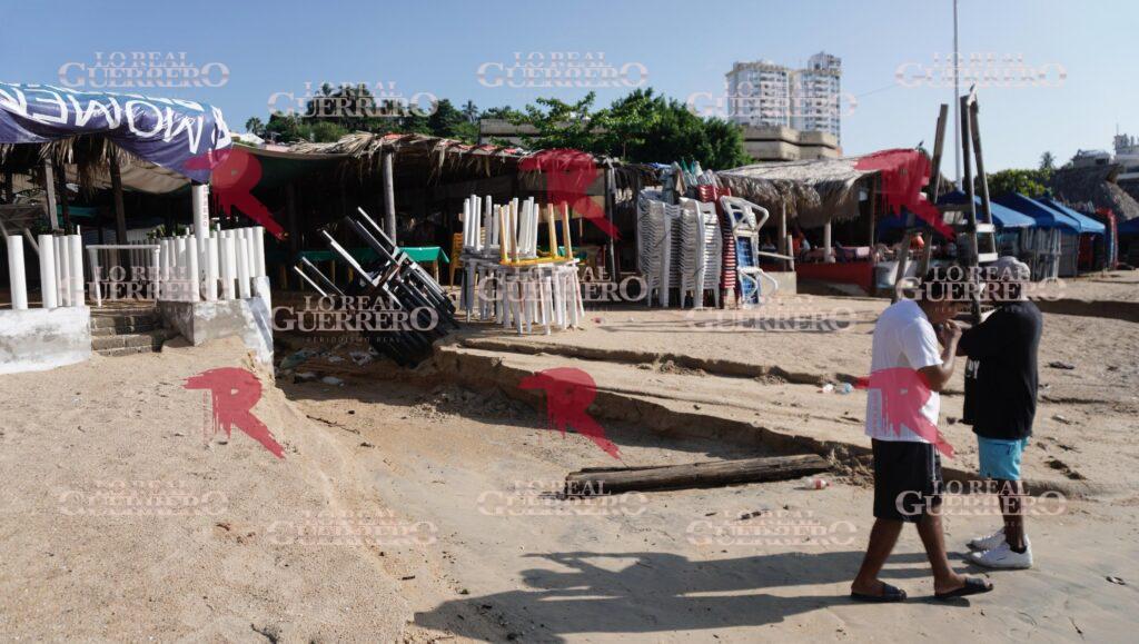 Acapulco, Gro., A 9 de septiembre del 2025.- Las lluvias registradas durante la madrugada de este martes ocasionaron el hundimiento de dos lanchas de prestadores de servicios turísticos y socavó parte de la arena de playa Caletilla.