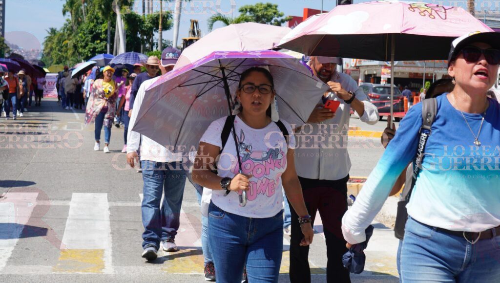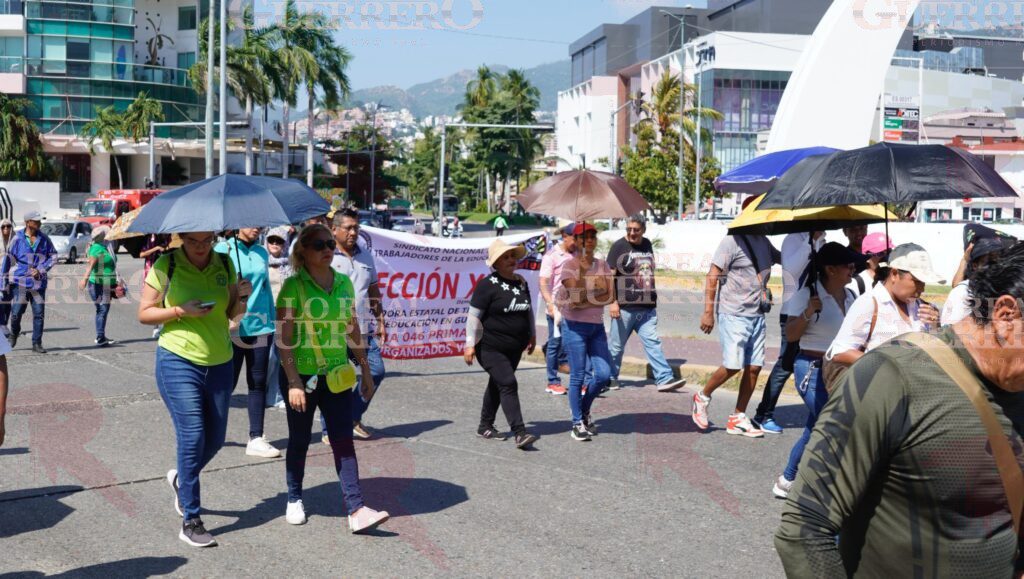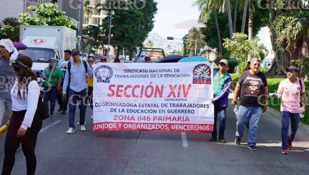 Acapulco, Gro., 13 de noviembre de 2025.– Maestros pertenecientes a la Coordinadora Estatal de Trabajadores de la Educación en Guerrero (CETEG), pero de una fracción distinta a la que liberó el paso en la caseta de cobro La Venta de la Autopista del Sol, realizaron una marcha por la avenida Costera Miguel Alemán de Acapulco la mañana de este jueves.