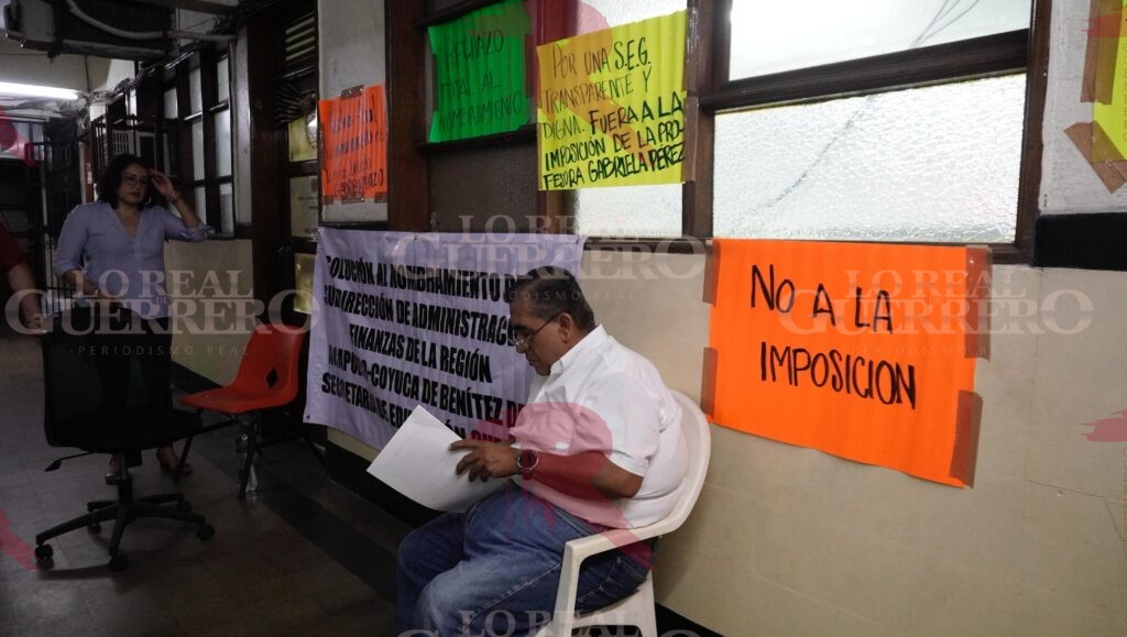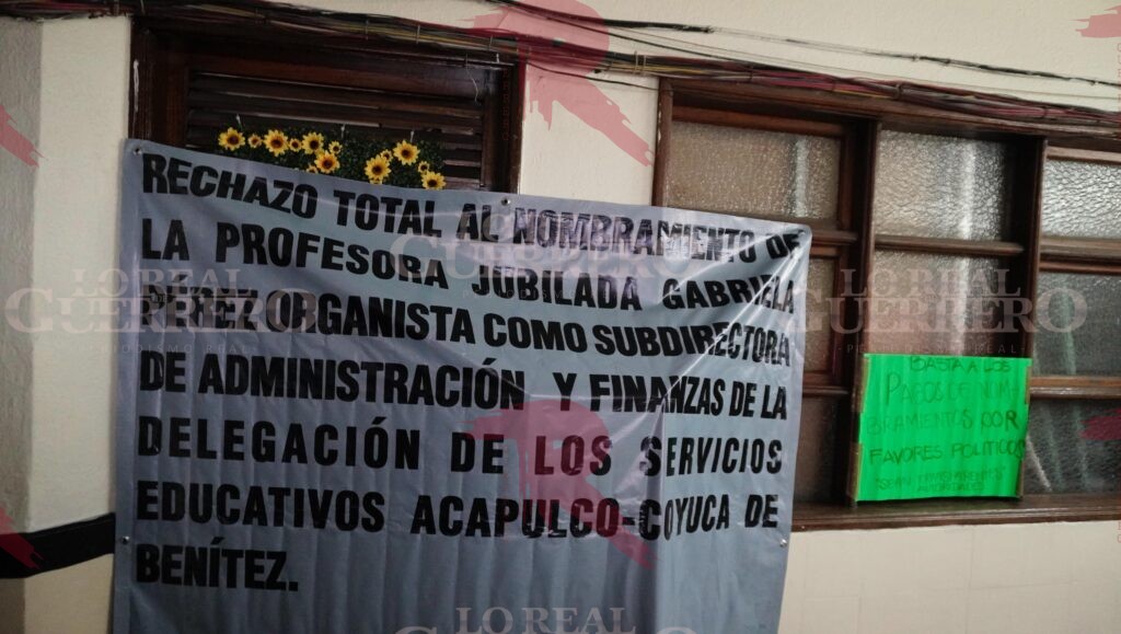 Acapulco, Gro., A 8 de septiembre del 2025.- Para pedir la destitución de la subdirectora de Administración y Finanzas de la delegación de los Servicios Educativos de la región Acapulco-Coyuca de Benítez, empleados de la dependencia pararon labores y cerraron sus oficinas