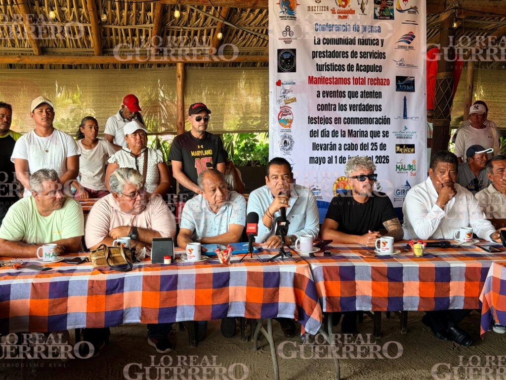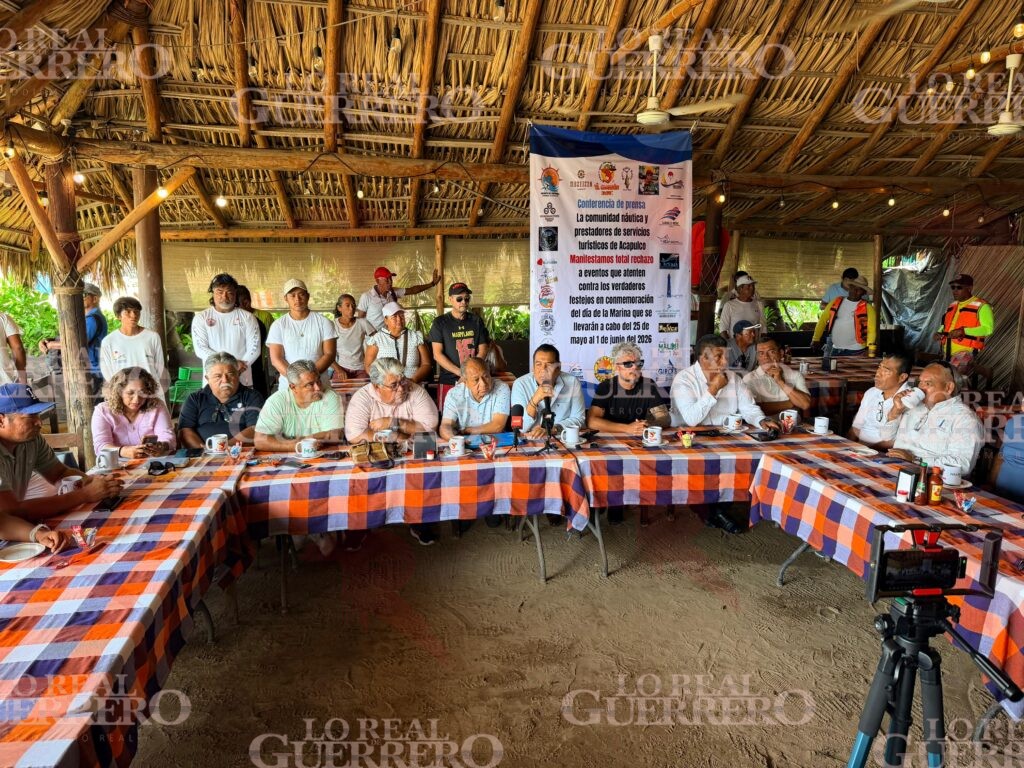 Acapulco, Gro., a 23 de abril de 2026.- Integrantes del sector náutico, como prestadores de servicios, pescadores y arrendadores de yates, se pronunciaron en contra de la organización de eventos alternos para festejar el Día de la Marina, al considerar que una empresa privada pretende sacar provecho de la celebración.