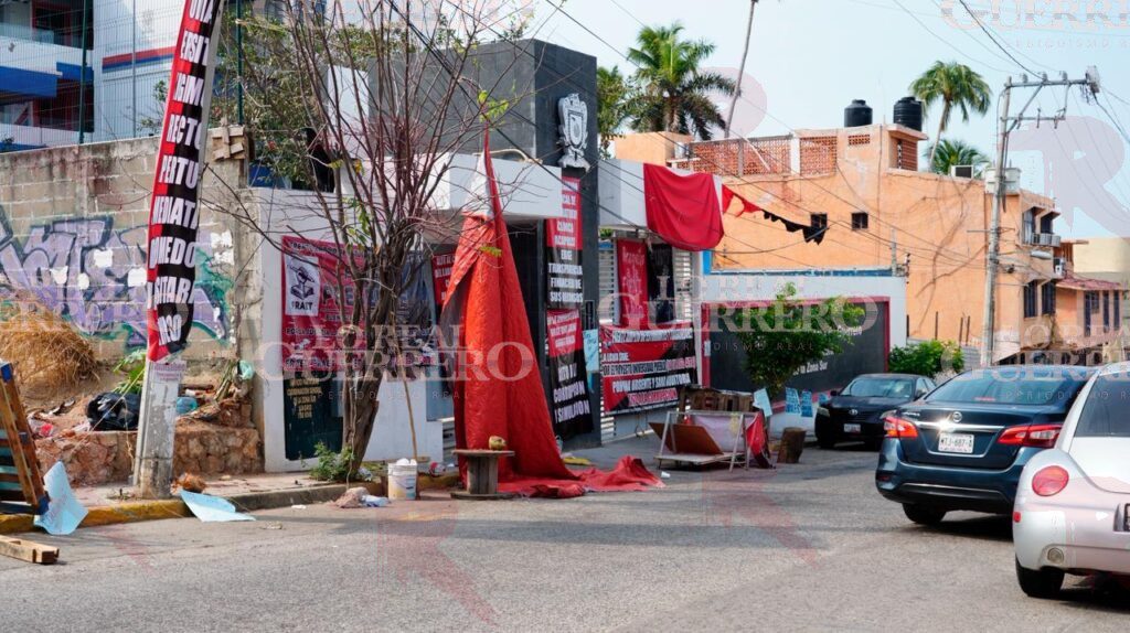 En el campamento improvisado se observan trastes de comida, botellas de agua, lonas con consignas, así como sangre regada sobre la banqueta y parte de la calle Río Balsas, en la colonia Vista Alegre.